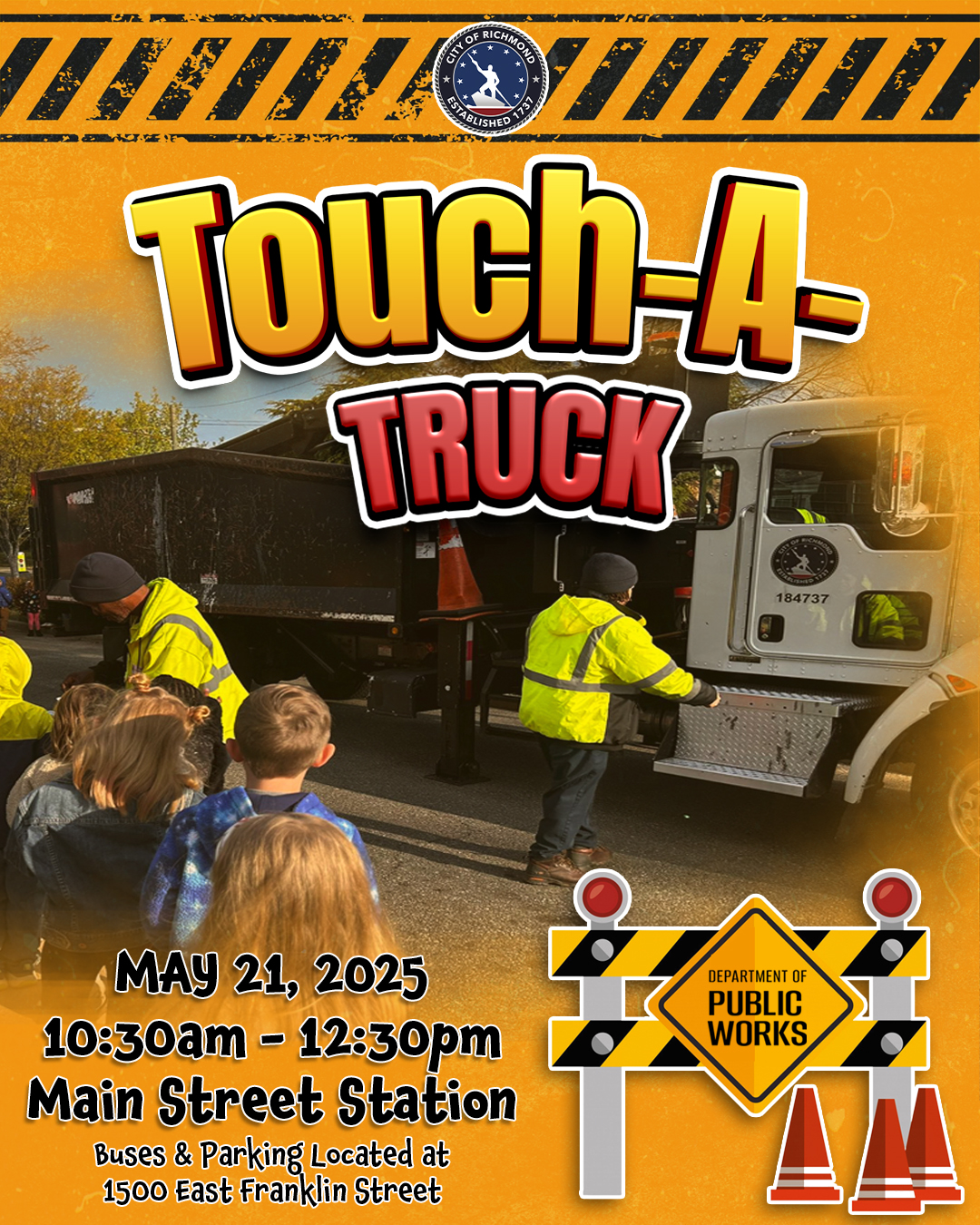 In celebration of National Public Works Week, the Richmond Department of Public Works (DPW) is hosting its first ‘DPW Touch A TruckDPW Touch-A-Truck’ Event on Wednesday, May 21 from 10:30 a.m. to 12:30 p.m. at Main Street Station. This exciting, free event is designed as a fun way to teach elementary school-aged children about the essential services provided by public works professionals. The event will provide students with a “behind-the-scenes” opportunity to meet the staff who operate the vehicles and watch live demonstrations of the equipment in action.