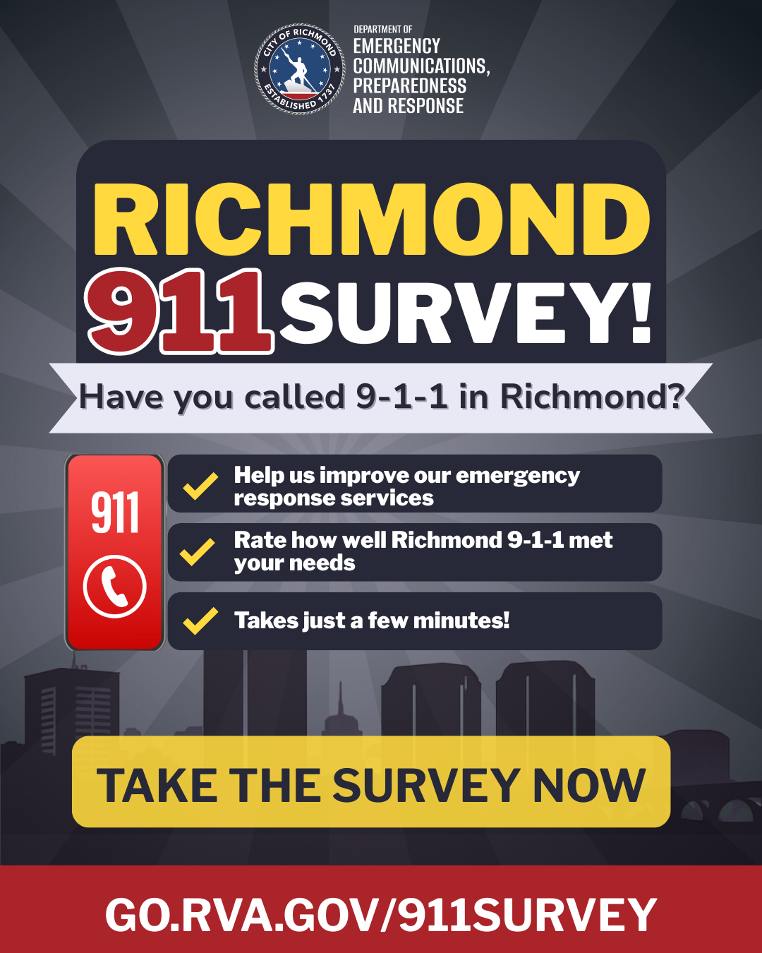 The 2025 Citizens Survey gives residents the opportunity to share feedback about their experience calling 911. Your responses help us evaluate our service, identify areas for improvement, and continue providing timely, professional emergency communications to the city of Richmond.