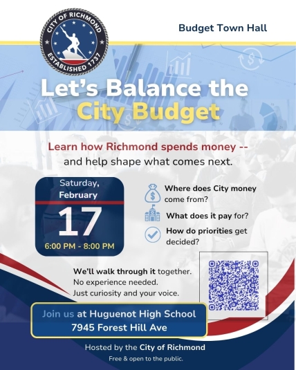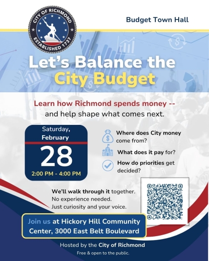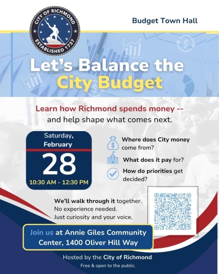 The City of Richmond is inviting residents to take part in a series of Budget Town Halls, providing a forum for shared community input on Fiscal Year 2027 (FY27) budget priorities and an opportunity to better understand how the City's budget is developed and executed.