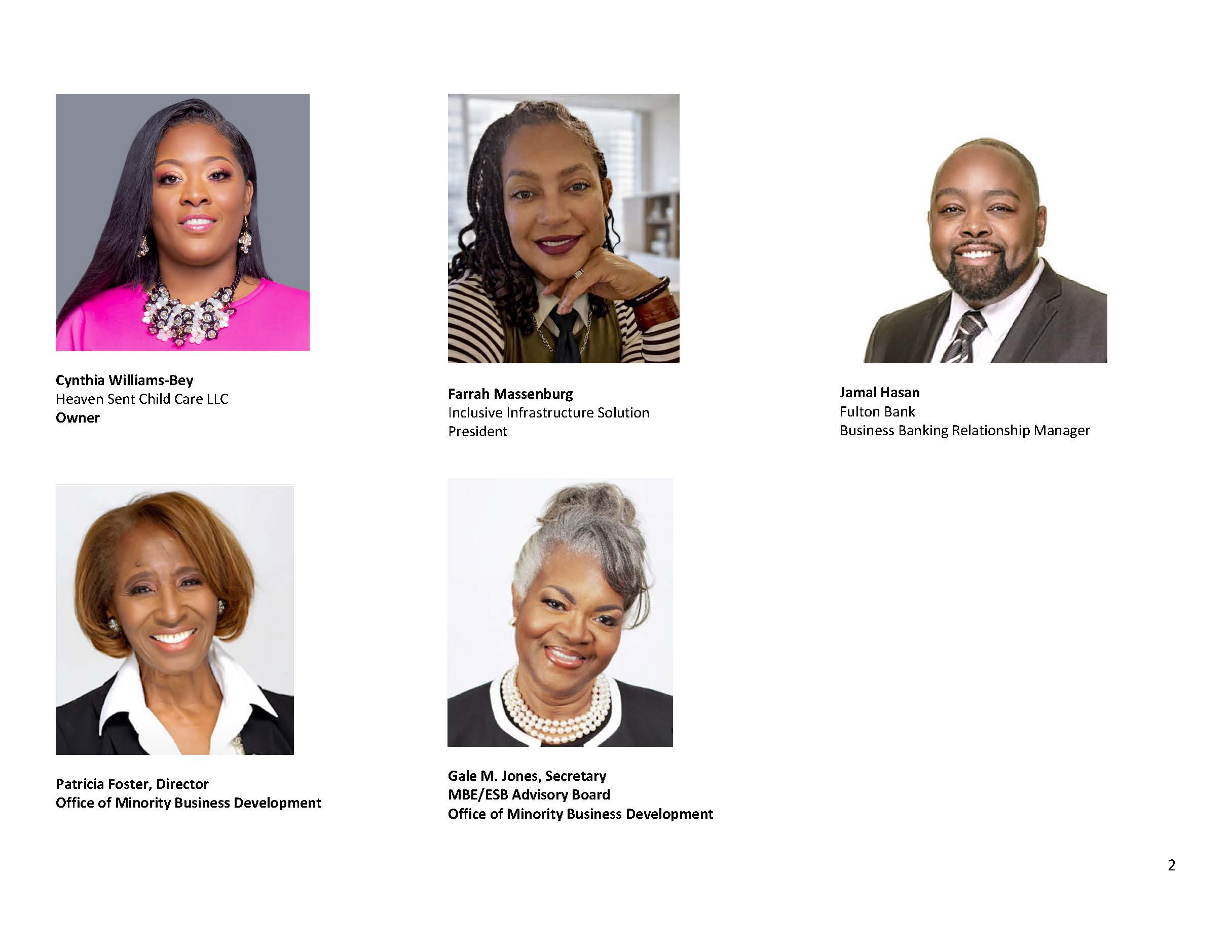 The Minority Business Enterprise/Emerging Small Business Advisory Board (MBE/ESB) is composed of nine representatives of a minority business enterprise, two lenders or businesses other than a minority business enterprise, one Section 3 Contractor representative and one either at-large resident of the city or a member of the City Council.