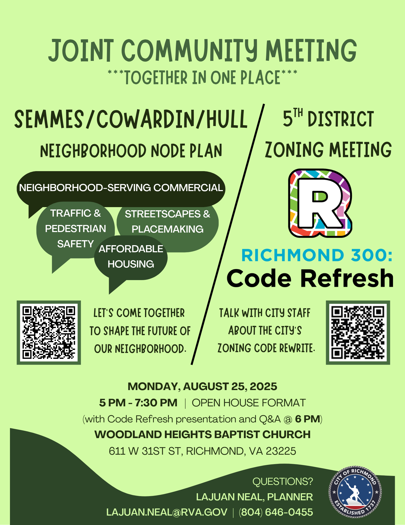 The City of Richmond hosted a joint community meeting on August 25, 2025, to kick off the start of the Semmes Cowardin Hull Neighborhood Node Plan and also discuss the initial draft of the city’s Code Refresh zoning rewrite rewrite project. At this open house-style community meeting, attendees came together to share their thoughts about the future of the neighborhood and offer ideas on how to address challenges that the area has been facing in recent years. In total, 74 community comments were received, touching on a variety of topics including the need for a grocery store, the need for safety improvements for people who walk and bike, and the desire for community spaces and enhanced connectivity to greenspace.