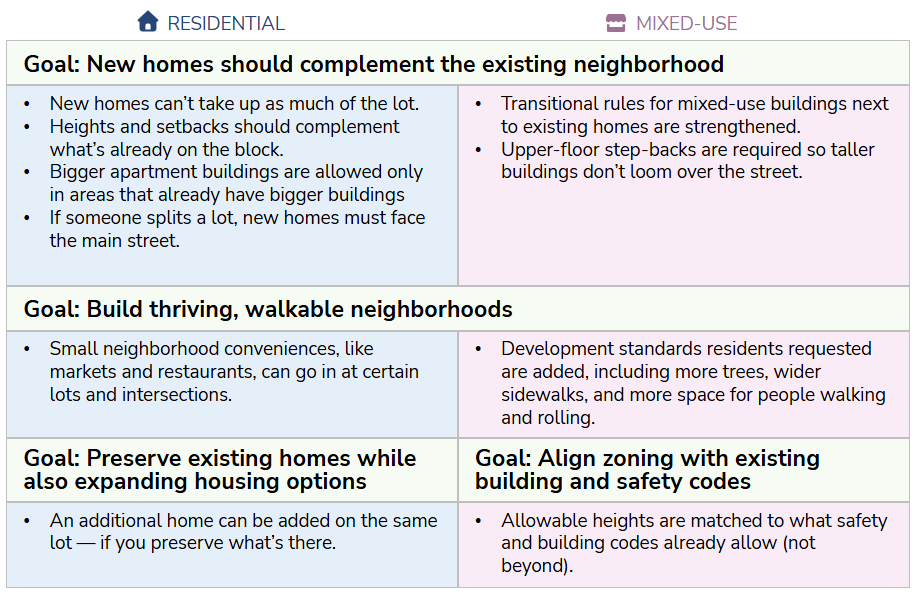 - Improves development standards by requiring trees, wider sidewalks, and building designs that complement existing neighborhoods.