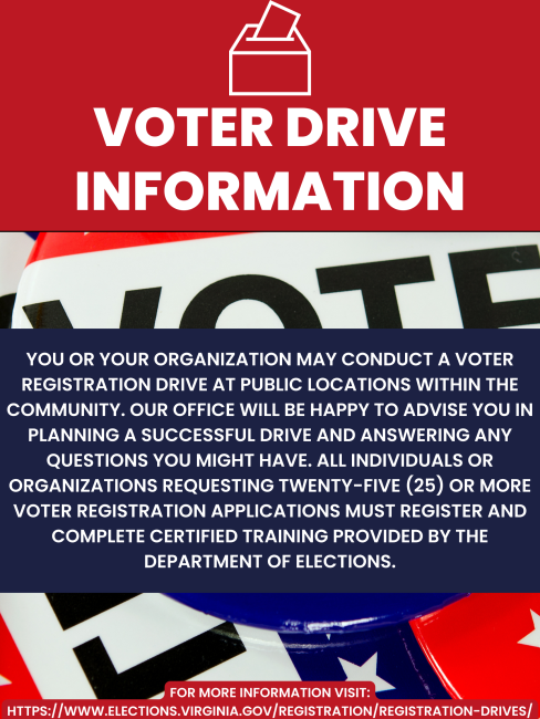 You or your organization may conduct a voter registration drive at public locations within the community. Our office will be happy to advise you in planning a successful drive and answering any questions you might have. All individuals or organizations requesting twenty-five (25) or more voter registration applications must register and complete certified training provided by the Department of Elections.