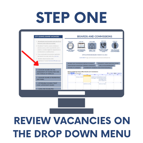 For more information regarding individual board and/or commission membership requirements, visit the Clerk's application portal linked below, or review where a vacancy is in the process to the left (computer) or by scrolling down below (mobile phone/tablet): https://starapp2.richva.ci.richmond.va.us/applications/BoardsCommissions/index.aspx.