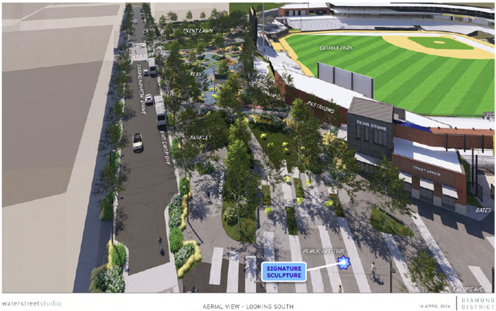 Signature Sculpture – Located beside the entryway to the new Diamond District ballpark, the sculpture will be a highly visible component of the park and the first of its public art installations. The permanent sculpture should be large in scale and could include interactive or functional components (ie. seating, shade, etc.) to encourage visitor engagement. (specs to be added on scale, dimensions of the site, etc.) Artists are encouraged to consider the following objectives: