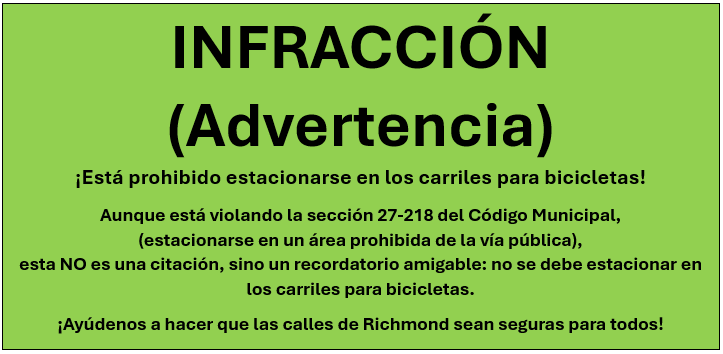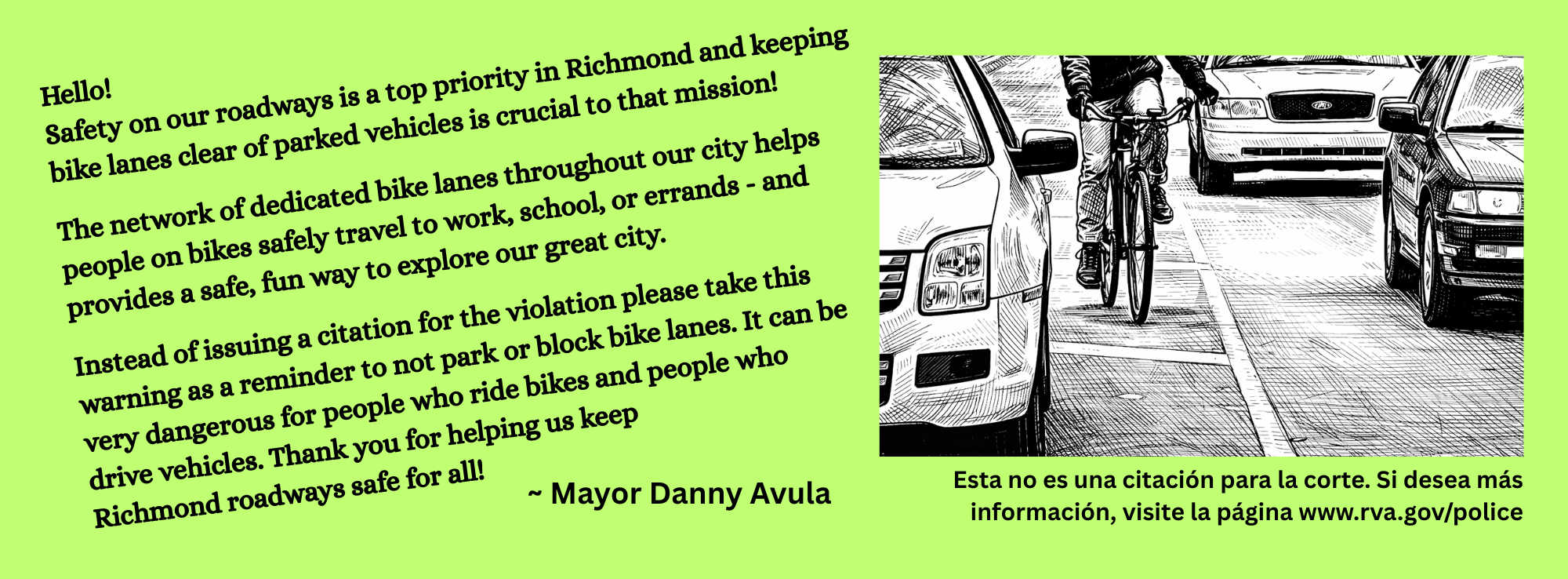 “This safety initiative is a reminder to not park or block bike lanes,” said Richmond Mayor Danny Avula. “It can be very dangerous for people who ride bikes and people who drive vehicles. Thank you for helping us keep Richmond roadways safe for all!”