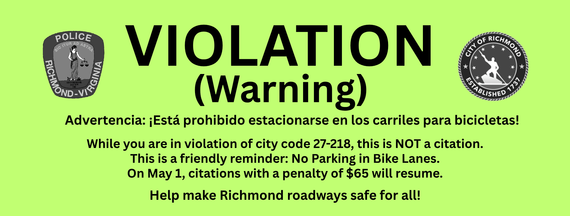 In the month of April, Richmond Police Department officers and Richmond’s parking enforcement vendor will place a violation warning, seen below and attached, on the vehicle instead of a parking citation.