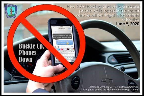 While the Commonwealth of Virginia has passed a similar law which takes effect in 2021, in Richmond, beginning June 9, 2020, drivers using their handheld personal communications device while driving on a public street or highway in the City of Richmond could be found guilty of distracted driving and be fined.