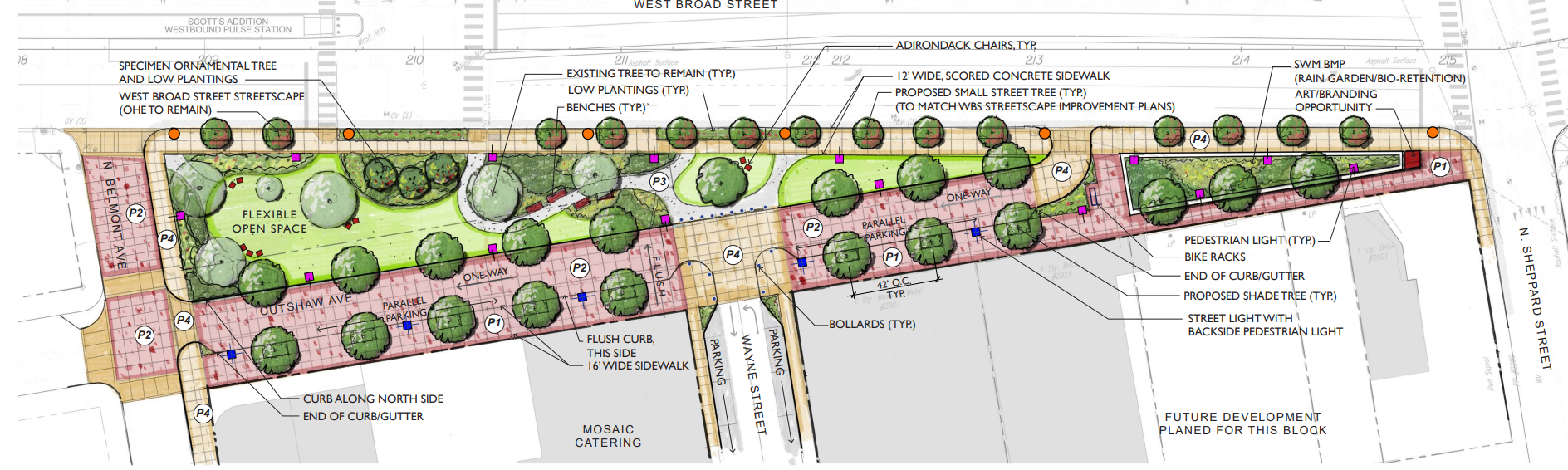 The West Broad Street Green/Pollinator Park Street closure was the first Lighter Quicker Cheaper project under Richmond Connects. It took place from Wednesday, May 8th, to Wednesday, July 24th, 2024, and involved the closure of Cutshaw Ave from Wayne St to Sheppard St. The project was done in collaboration with the Greater Scotts Addition Association and intended to create a larger space for residents to recreate, as well as to improve pedestrian safety along Broad Street.